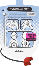 This training pad package includes one set of training pads and a connector wire assembly in a sealed pouch. These training pads, along with a training battery pack and training software, enable the standalone trainer to be used for instructional purposes. The training pads are semi-adhesive, allowing for multiple uses and are non-functional so they cannot be used to deliver a defibrillation shock. The pads themselves can be replaced by attaching to the connector wire assembly with Velcro.